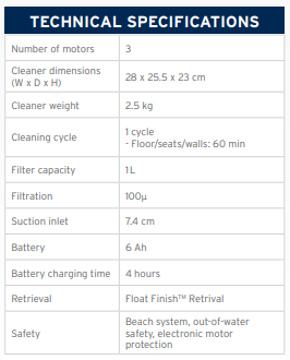 Designed for everyday convenience, Spabot includes one-touch start, a simple interface to show battery level and cycle progress, and a 100-micron / 1L filter canister to capture fine debris. With a 4-hour recharge, it’s ready for the next clean in no time.